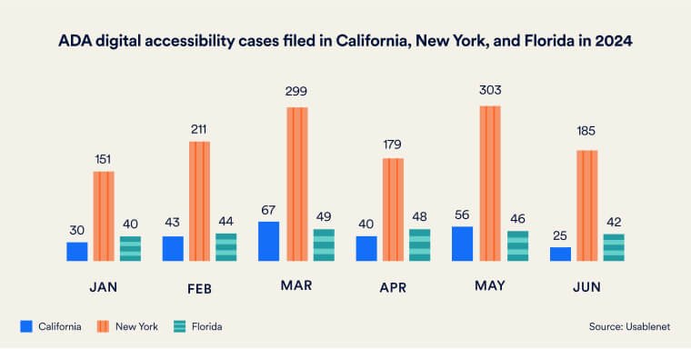Digital accessibility lawsuits are most prevalent in New York state. While accessibility-related legal action occurs across the country, the highest number of claims occur in New York’s state and federal courts, making it a critical focus area for companies operating in or selling goods and services to customers in this state.