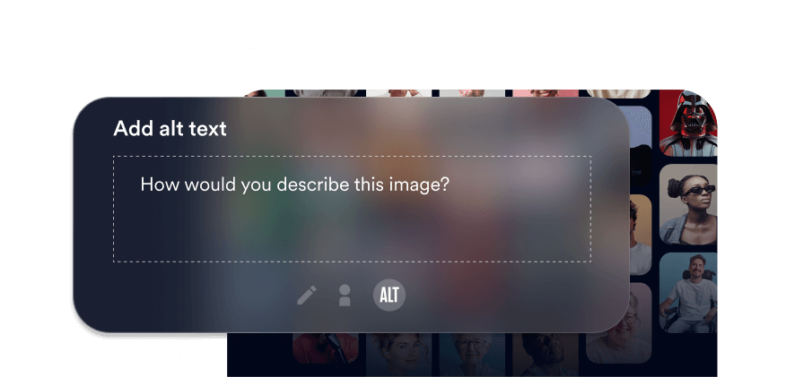 Alternative text (alt text) is a brief textual description of an image. Alt text is essential for people using screen readers or braille displays (like people who are blind or have low vision) to understand visual content. Additionally, if an image doesn’t load, the alt text is what gets displayed instead - helping everyone. Pro tip: alt text helps boost SEO and engagement on your website, web apps, digital files, and social media.