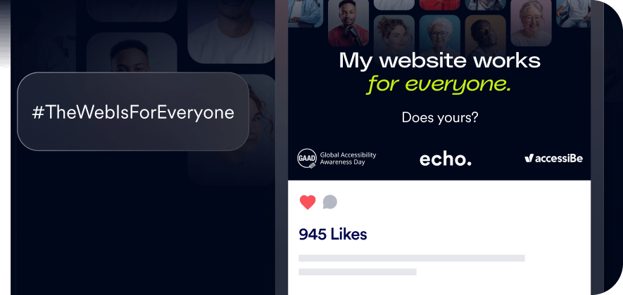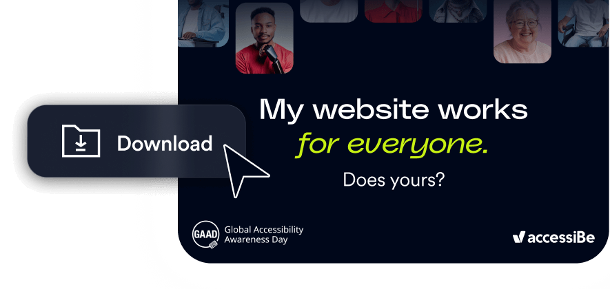 A photo collage of people and animated characters with disabilities, set against a dark background. The text reads: “My website works for everyone. Does yours?” Below the text are the logos for GAAD and accessiBe.