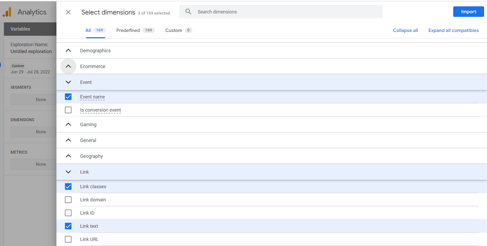 3. In "Select dimensions" search and add "Event Name", "link classes" "link text", and click import.
