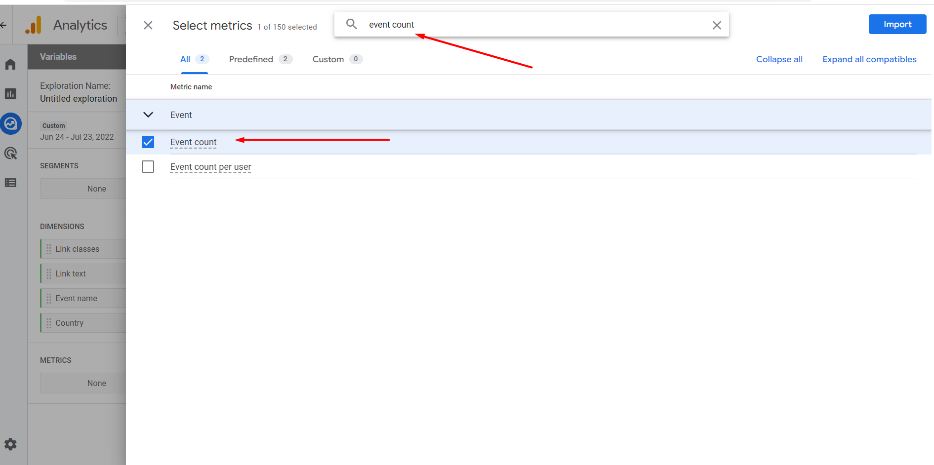 5. Select the metric “Event count” and click import