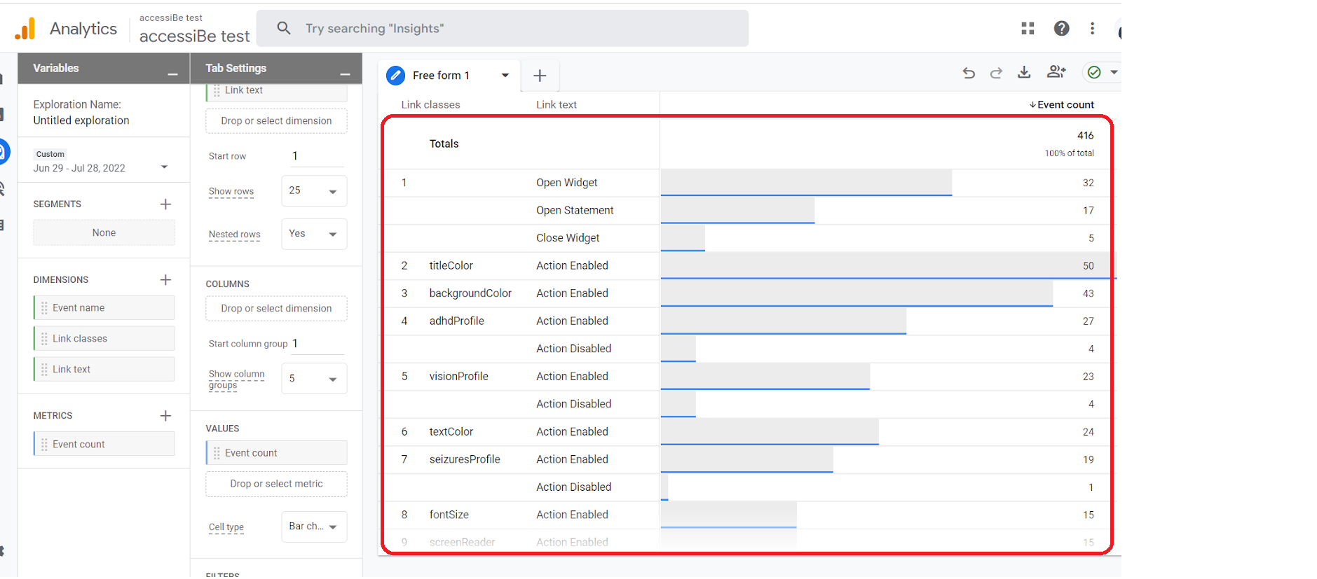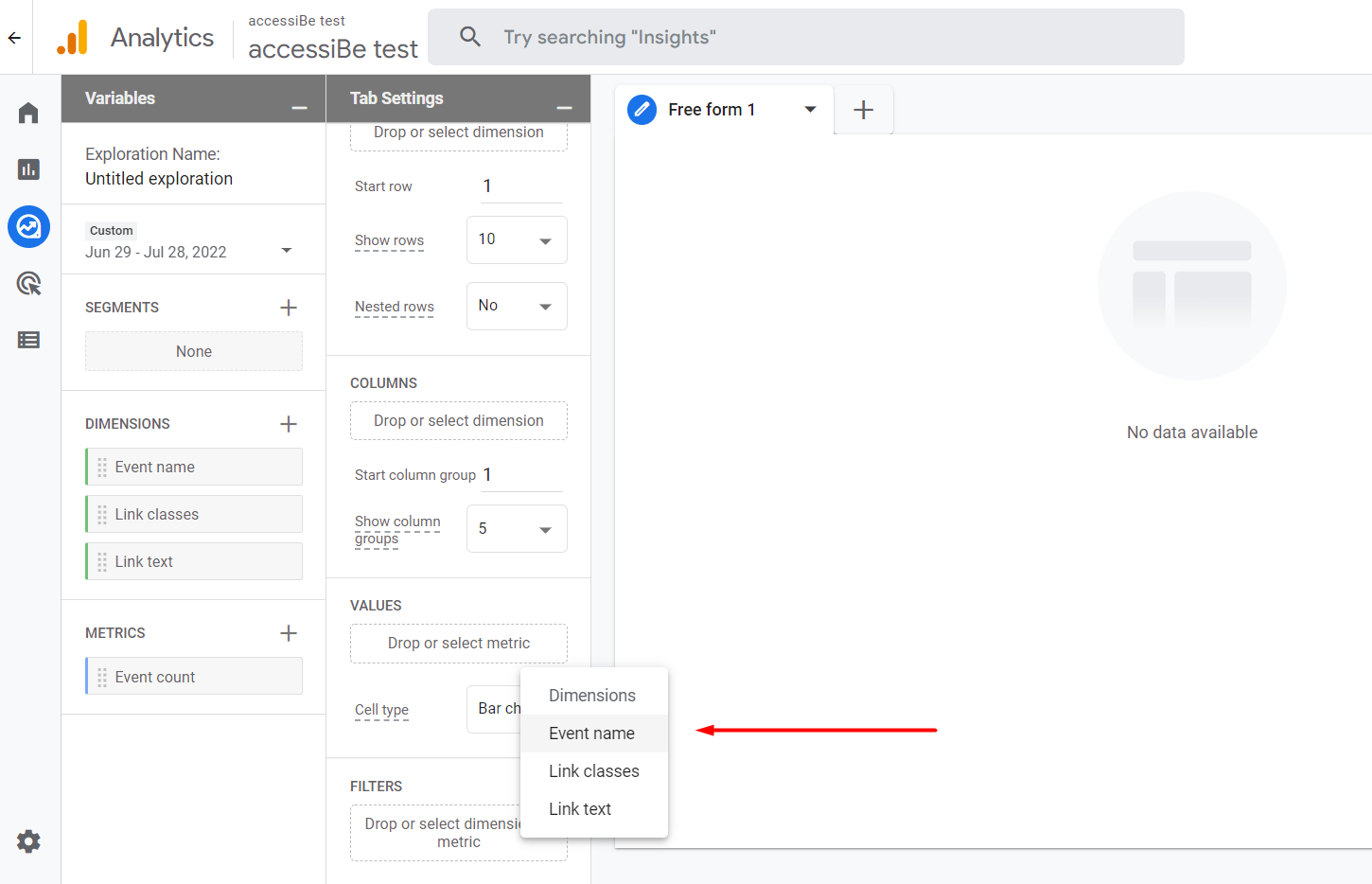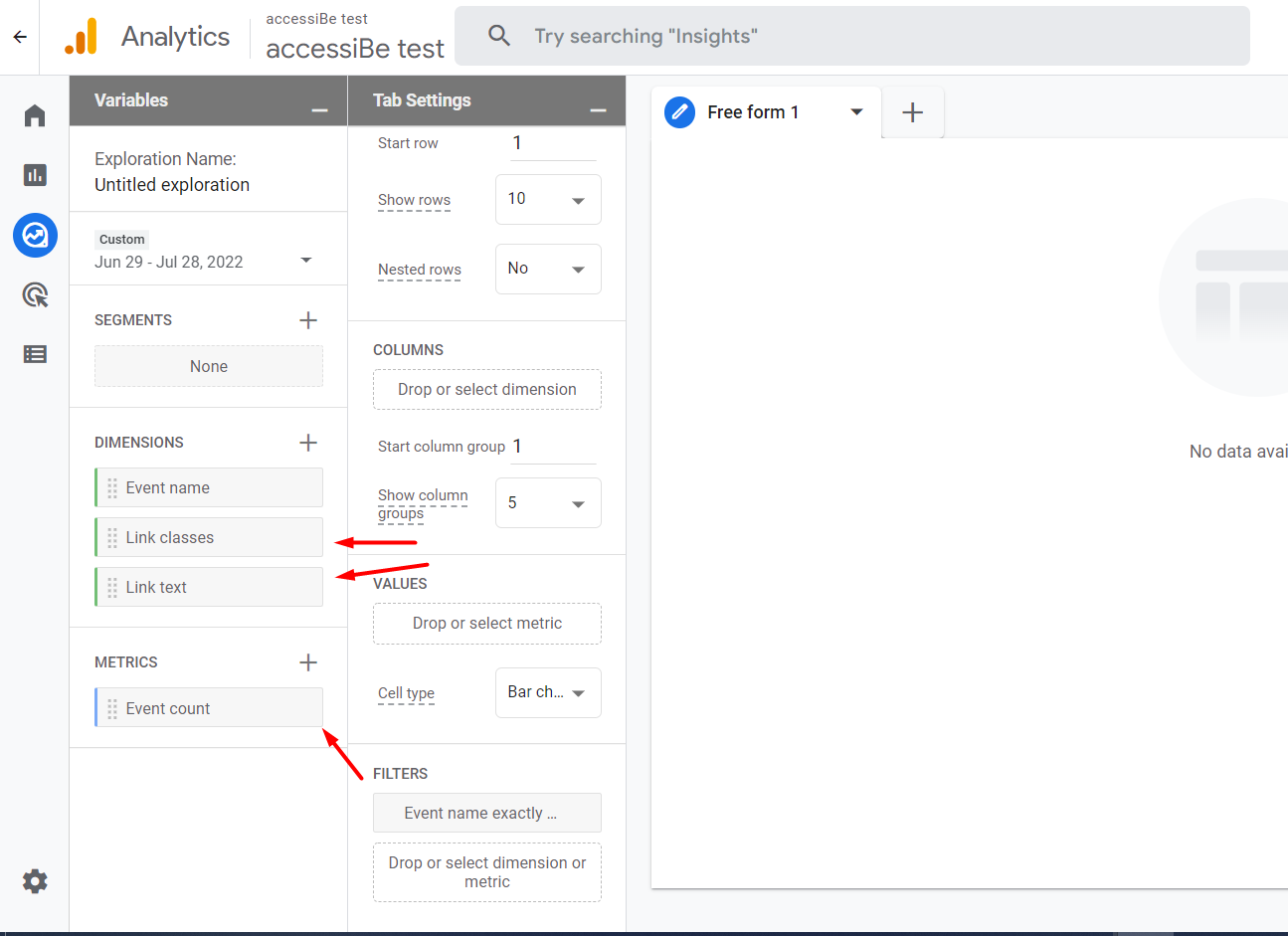 8. Double click on “link classes” “link text” and “event count”