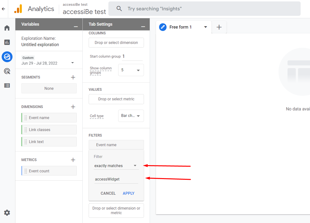7. Filter by “exactly matches”, type “accessWidget” and click Apply
